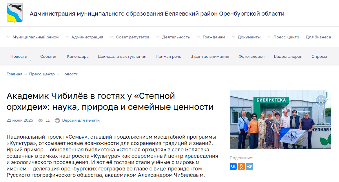 На сайте Администрации муниципального образования Беляевского района Оренбургской области вышла статья, посвященная посещению сотрудниками Института степи УрО РАН во главе с академиком РАН, доктором географических наук, профессором А.А. Чибилёвым обновленной библиотеки «Степная орхидея» в селе Беляевка, созданной в рамках нацпроекта «Культура».