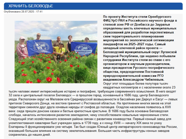 В газете «Наука Урала» (№ 13-14, июль 2025) вышла статья «Хранить Беловодье», посвященная посещению сотрудниками Института степи УрО РАН Беловодского муниципального округа Луганской Народной Республики – одного из шести ключевых муниципальных образований для разработки перспективных схем территориального планирования мероприятий по экологической оптимизации ландшафтов на 2025–2027 годы по проекту Института степи и Российского научного фонда в степной зоне Российской Федерации от Донбасса до Зауралья.