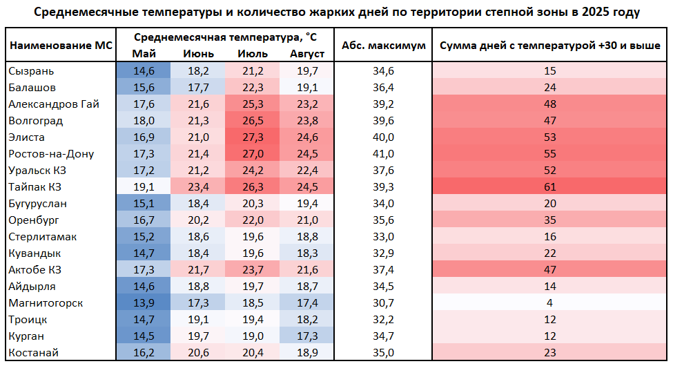 Таким образом, на большей части степной зоны летний сезон 2025 года отметился достаточным или избыточным увлажнением благодаря активному циклогенезу. Количество жарких дней увеличивалось с северо-востока на юго-запад с максимумом на территориях, прилегающих к Прикаспийской низменности и Азовскому морю, где в июле-августе преобладали выносы в тёплом секторе циклонов. В Ростовской области в июле сложилась сложная обстановка в связи с почвенной засухой, во многих муниципальных образованиях был введён режим ЧС.