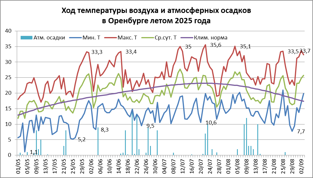 За весь летний период количество жарких дней увеличивалось в юго-западном направлении – чем ближе к Прикаспийской низменности, тем интенсивнее и продолжительнее были волны жары. Меньше всего жарких дней (с  максимальной температурой +30 °С и выше) на исследуемой территории было в Магнитогорске – лишь 4. В Оренбурге было зафиксировано 7 волн жары (см. график), в общей сложности в городе отмечено 35 дней с температурой +30 °С и выше, синоптические ситуации динамично следовали друг за другом, затяжных холодов или продолжительного изнуряющего зноя не отмечалось.