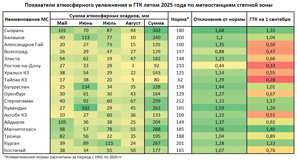 На большей части степной зоны от Волгоградской до Курганской области в течение мая – июля наблюдались многочисленные ливни и грозы. Суммы атмосферных осадков местами достигали 3-4-х месячных норм (Айдырля и Сызрань в мае, Балашов, Бугуруслан и Кувандык в июне, Курган в июле). В августе увлажнение сократилось в Причерноморье и на Средней Волге, а на Южном Урале также осталось выше среднемноголетних значений. В итоге за весь летний период дефицит осадков сложился только на юго-западе – в Ростовской и Волгоградской областях. При этом в Ростове-на-Дону за май-август выпало менее половины климатической нормы осадков. Универсальный показатель влагообеспеченности территории – гидротермический коэффициент Г.Т. Селянинова – на Южном Урале и в Среднем Поволжье на 1 сентября составил около единицы или более, что говорит об обеспеченном или избыточном увлажнении. В Северном Причерноморье, на Нижней Волге, а также на северо-западе Казахстана, несмотря на обильные осадки, индекс ГТК составил 0,3 – 0,6 (зона сухого земледелия и ирригации). Причиной тому стали высокие температуры в июле и августе на данной территории.