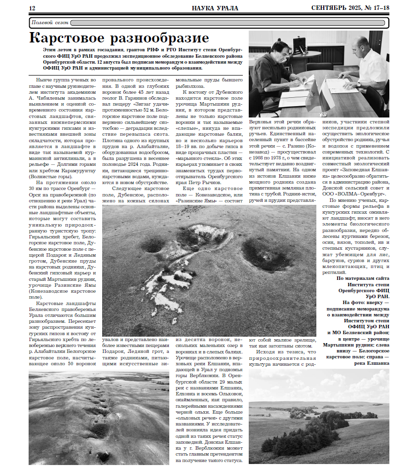 В газете «Наука Урала» (№ 17-18, сентябрь 2025) вышла статья «Карстовое разнообразие» об экспедиционном обследовании группой ученых Института степи УрО РАН Беляевского района Оренбургской области. С полным текстом статьи можно ознакомиться по ссылке: https://uran.ru/sites/default/files/nu-pdf/nu_17_2025web.pdf