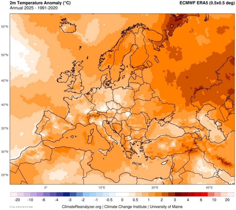 Отклонения значений среднегодовой температуры воздуха в 2025 г. от многолетних значений (1991-2020)