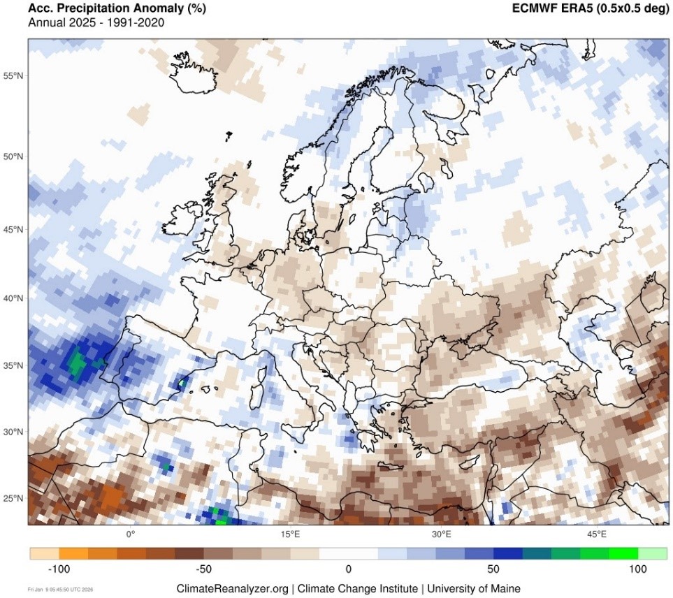 Отклонения суммарных значений годовых осадков в 2025 г. от многолетних значений (1991-2020)
