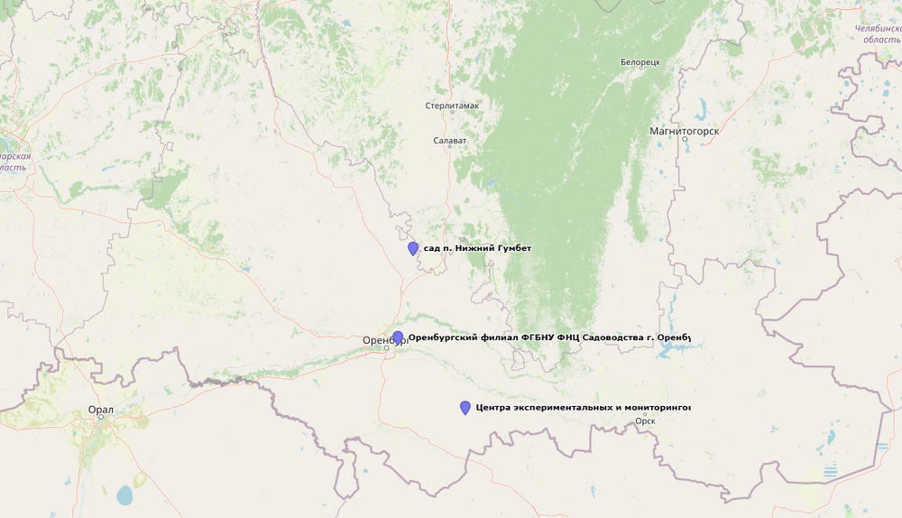 В Оренбургской области стланцевые яблони используются в посадках Октябрьского района п. Нижний Гумбет, Оренбургского филиала ФГБНУ ФНЦ Садоводства г. Оренбург и Беляевского района п. Сазан на территории стационара (рис. 1). Опыт на южном участке позволит испытать яблоню в экстремальных условиях зимнего и летнего периода степной зоны.