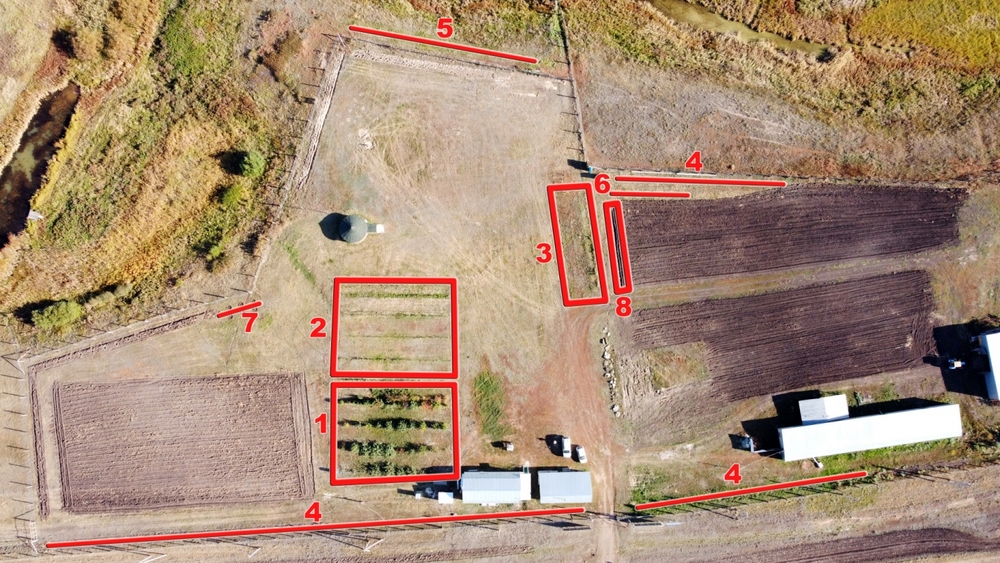Рисунок 2. Центр экспериментальных и мониторинговых исследований стационара «Оренбургская Тарпания» Условные обозначения к схеме: 1 - Сад карликовых (стланцевых) форм яблони. 2 - Питомник яблони и груши. 3 - Экспериментальная площадка плодово-декоративных культур. 4 - Лесная полоса (тополь). 5 - Лесная полоса (ива). 6 - Экспериментальная площадка (виноград). 7 - Экспериментальная площадка (ирга ольхолистная, смородина золотистая, калина, бузина). 8 -Экспериментальная площадка (черенки тамарикса, косточки абрикоса, сливы, вишни)