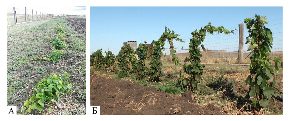 Рисунок 8 – Виноград сорт Память Домбковской. А) Июнь 2025 г.; Б) Сентябрь 2025 г.