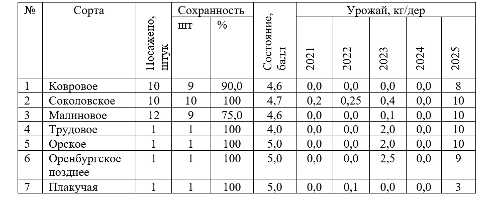 На данном этапе исследований отмечено начало плодоношения отдельных сортов. Наиболее скороплодным был сорт – Соколовское. Большие надежды подают Трудовое, Орское, Оренбургское позднее. Необходимо отметить, что за период формирования плодового дерева, крона трижды была поражена грызунами (мыши, зайцы) до 2-2,5 балла. В связи с этим были проведены работы по лечению поврежденных участков (обрезка и замазка садовым варом). Несмотря на повреждения, учеты проведенные в 2024 г. показали жизненное состояние деревьев от 4 до 5 баллов. В 2023-2024 гг. мы наблюдали обильное цветение весной, но поздневесенние заморозки повреждали плодовые завязи, и как следствие урожай отсутствовал. В 2025 г. несмотря на сильное повреждение кроны и штамба грызунами (зайцы, степная пищуха) яблони обильно цвели.У отдельных деревьев цветы покрывали до 50% кроны. Был отмечен первый хороший урожай до 10 кг с дерева.