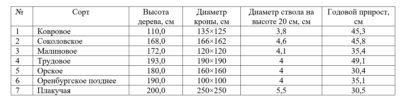 Сила роста деревьев находятся в пределах 2 м (табл. 2). Минимальная высота сорта Ковровое не превышает в среднем 1,1 м, максимальная высота в пределах 2 м у сортов Плакучая, Трудовое (рис. 4) и Оренбургское позднее. Диаметр кроны колеблется от 1 (Оренбургское позднее) до 2,5 м (Плакучая). Диаметр ствола на высоте 20 см в среднем составляет 4 см. Выше среднего диаметр штамба у сортов Плакучая, Соколовское, Малиновое. После того как был организован в саду капельный полив годовые приросты в 2025 г. достигали 50 см и более, в 2024 г. они не превышали 30 см.