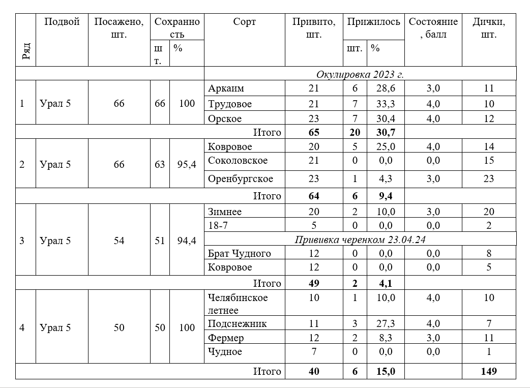 Таблица 3 – Состояние, сохранность и приживаемость яблони на подвоях Урал 5 в питомнике. Посадка подвоев 12.04.23. Сохранность на 4.06.24. Приживаемость прививок на 10.07.24