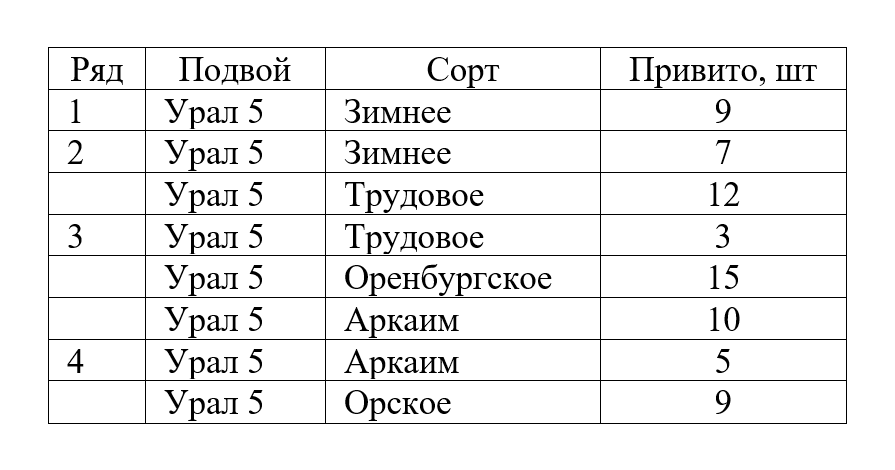 Таблица 4 – Сорта, привитые на подвоях Урал 5 в питомнике в 2025 г.