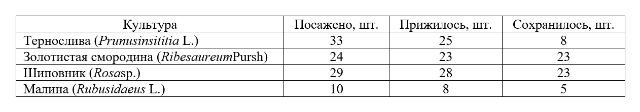 III Экспериментальные площадки плодово-декоративных культур. С целью озеленения участка осенью 2024 г. в 3 ряда высажены 96 саженцев плодово-декоративных культур (рис. 7) – Тернослива (Prunusinsititia L.), Золотистая смородина (RibesaureumPursh), Шиповник (Rosasp.) и Малина (Rubusidaeus L.). Весенние учеты в 2025 г. показали высокую приживаемость саженцев, но суровые условия летнего периода значительно сократили их количество (табл. 5). Тернослива оказалась самой уязвимой при приживаемости 76%, сохранность составила 24%. Лучшие результаты были у золотистой смородины, сохранность составила 95%.
