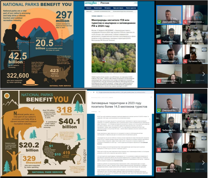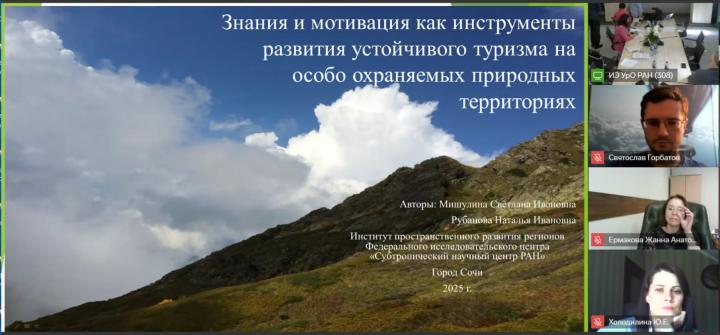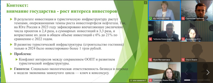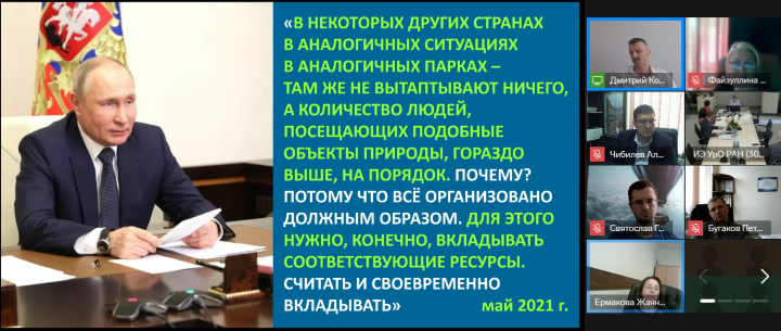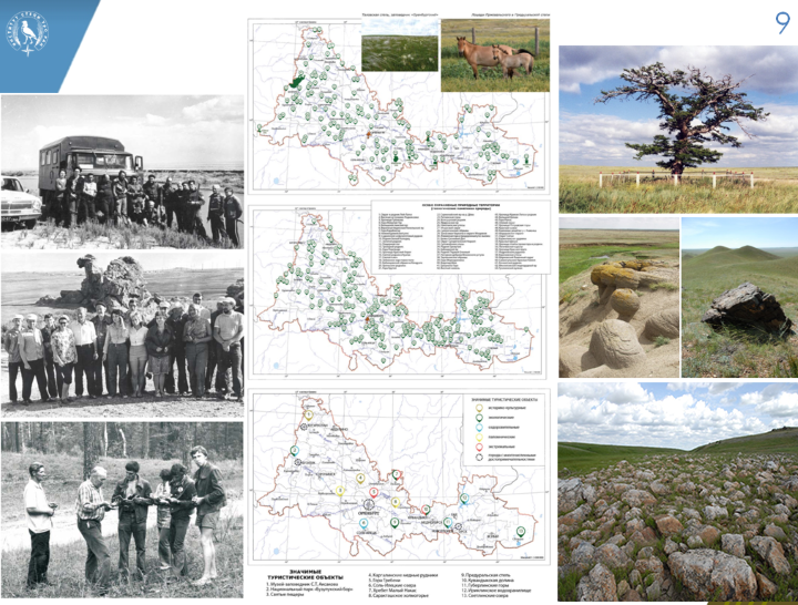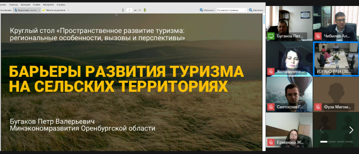 В докладе было отмечено, что Институт степи Уральского отделения РАН, основные направления деятельности которого связаны с изучением экологии, биологии, геоморфологии и агроклиматологии степей, что имеет непосредственное отношение к развитию моделей устойчивого природопользования и созданию новых перспективных направлений туризма, играет значительную роль в развитии рекреационного и туристического потенциала степных регионов России. Наличие в штате высококлассных специалистов заповедного дела, географов, ландшафтоведов, историков, археологов, ботаников, орнитологов, специалистов в области сельского хозяйства и региональной экономики всегда позволяло проводить комплексные исследования, изучать степи Северной Евразии в качестве единого географического, социально-экономического и культурно-исторического пространства. Благодаря этому Институтом накоплен богатый опыт выявления, обоснования и организации элементов заповедного каркаса и системы особо охраняемых природных территорий. Результаты исследований сотрудников Института основаны на многочисленных и масштабных полевых экспедициях, обобщении картографических материалов, анализе актуальных статистических данных по всем степным регионам, а многие методические подходы отработаны на примере Оренбургской области – в регионе, в котором базируется Институт степи и который выступает модельной территорией во многих исследованиях его научных подразделений.