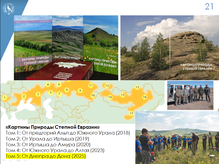 Также в своем докладе Александр Александрович отметил, что экспедиционная деятельность сотрудников Института и их влияние на развитие представлений о современном состоянии природы, для раскрытия потенциала в области рекреации и туризма не ограничивается пределами Оренбургского края. Красноречивым примером этому может служить иллюстрированная монография «Картины Природы Степной Евразии» посвященная ландшафтам низкогорных, холмистых и равнинных степей и лесостепей степных регионов России. Это направление развивает научный руководитель Оренбургского федерального исследовательского центра академик А.А. Чибилёв с сотрудниками научных отделов Института степи. Это исследование не завершено. Научный руководитель Института с коллегами неоднократно совершали совместные экспедиции Института степи и Русского географического общества в Республику Крым, Донецкую и Луганскую Республики. По мотивам этих исследований проводятся научно-популярные выставки книг и картин.